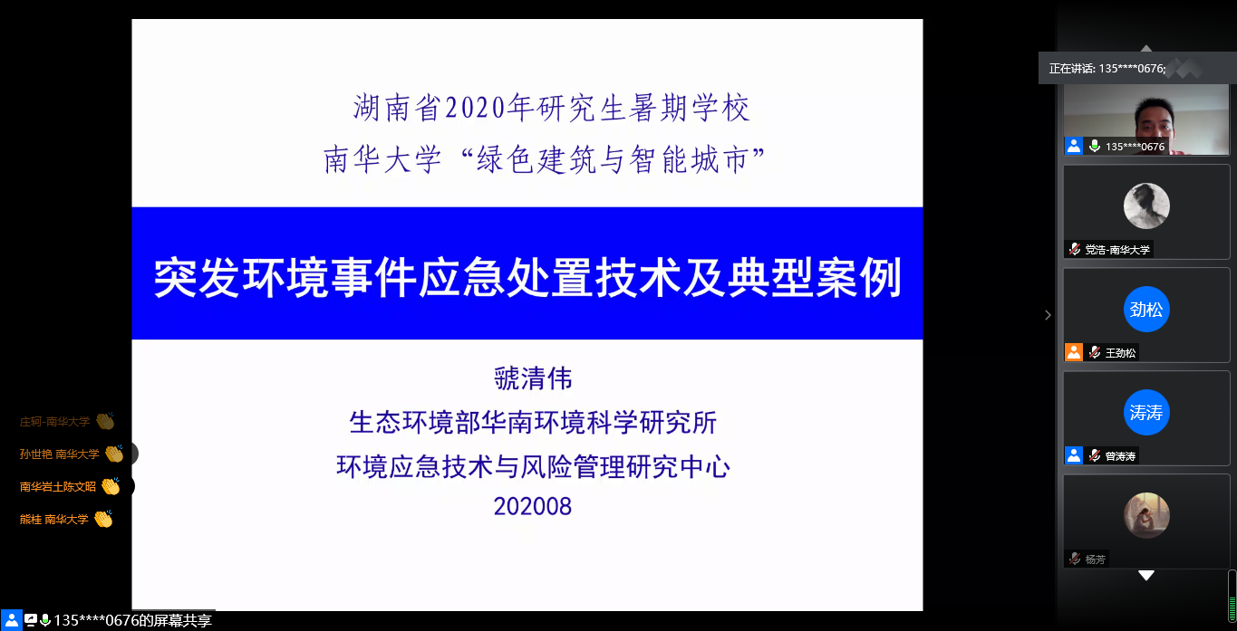 上午9:00,由生态环境部华南科学研究所虢清伟教授作学术报告,题目为《突发环境事件应急处置技术及典型案例》,公司王劲松副经理主持。虢教授首先介绍了突发环境事件的基本情况:突发性环境事件的结构性、布局性环境风险依旧突出,事件诱因呈复杂化态势,各方面高度关注对事件应对提出更高要求;然后虢教授介绍了一些应急处置技术,包括应急基本原则、技术体系、决策基本要领;最后虢教授讲述了几个突发环境事件的处理过程并对师生提出的一些疑问进行详细解答。