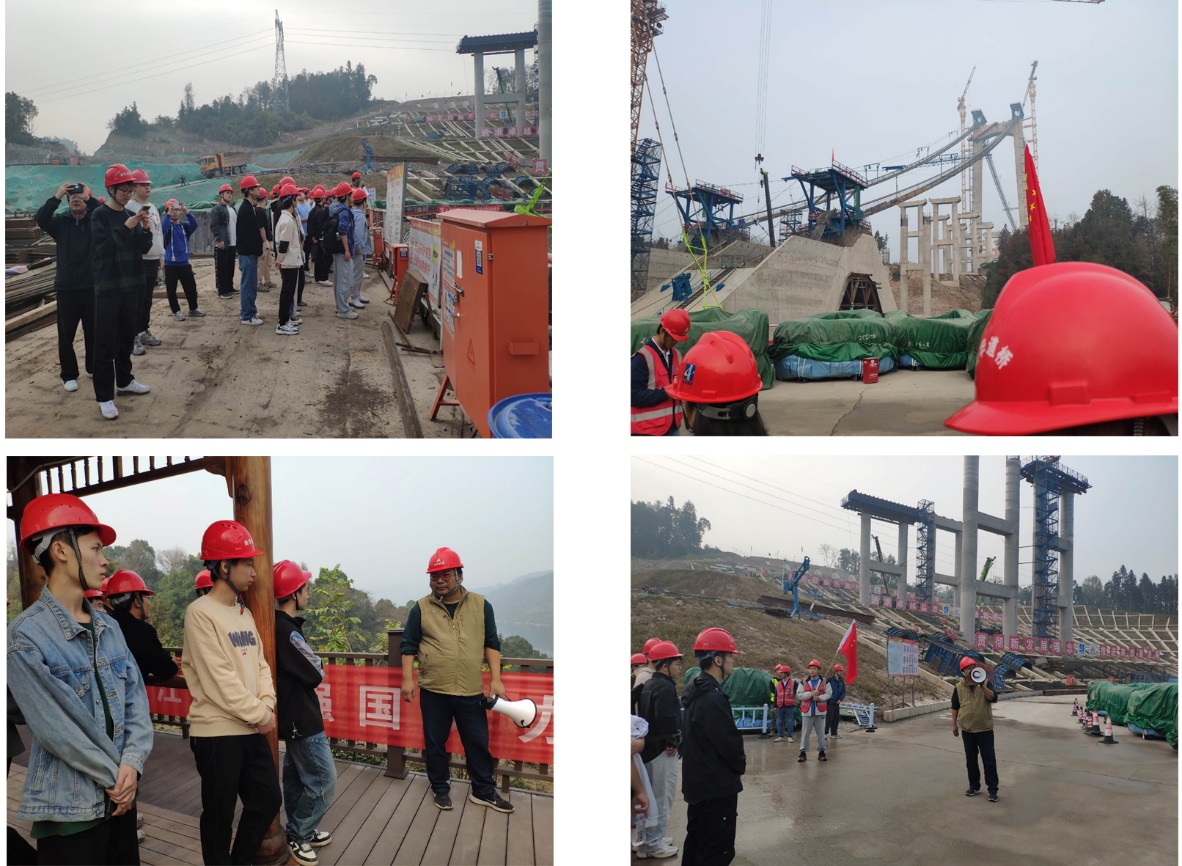 项目部副总工程师易继武和现场技术人员带领师生分别参观了大桥官庄岸高边坡防护工程、重力式锚碇、大桥主缆和引桥墩柱等项目现场,从项目概况、施工工艺、现场管理、新材料应用等方面进行讲解,并细心为员工现场答疑解惑。