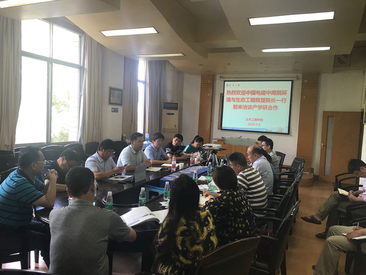 2020年7月4日上午10:30,中电建环保科技公司&中电建中南院环境与生态工程院楚凯峰副经理、俞立红副总工程师(98级给排水专业员工)、水务所谭艳忠所长一行,前来公司洽谈产学研合作,公司领导、教务办、市政工程系和市政环境实验室的老师参加了此次合作交流,会议由公司副经理王劲松教授主持。