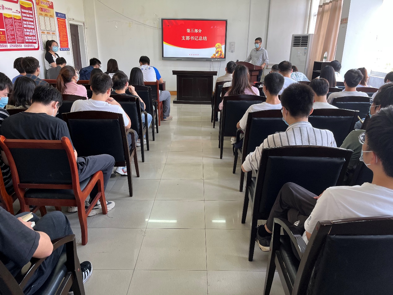 活动第五部分,第七党支部书记邹超同志和第八党支部书记陶秋旺同志分别做了总结发言。邹超同志强调,学习党的二十大精神,我们要原原本本学、反反复复学,各位党员同志不仅要在主题党日集中学习,还应该在科研工作之余,私底下多多研读二十大报告原文。陶秋旺同志强调,作为青年党员,我们应该在实践中练就过硬本领,锤炼品德修为,要将个人理想追求融入党和国家的事业中,要能用所学建设祖国,勇于担当,为实现中华民族伟大复兴的中国梦贡献自己的力量。