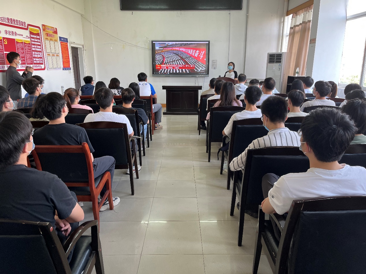 活动第一部分,全体党员同志观看了《二十大金句报告》、《我们这十年——中国跨度》、《中国式现代化》和《二十大报告——致中国青年》视频。视频强调了二十大报告重要思想,回顾了十年中国现代化建设中的每一个书写奇迹的跨越瞬间,系统深入地阐述了中国式现代化的科学内涵以及对中国青年的殷切期望。