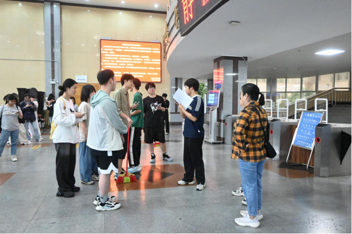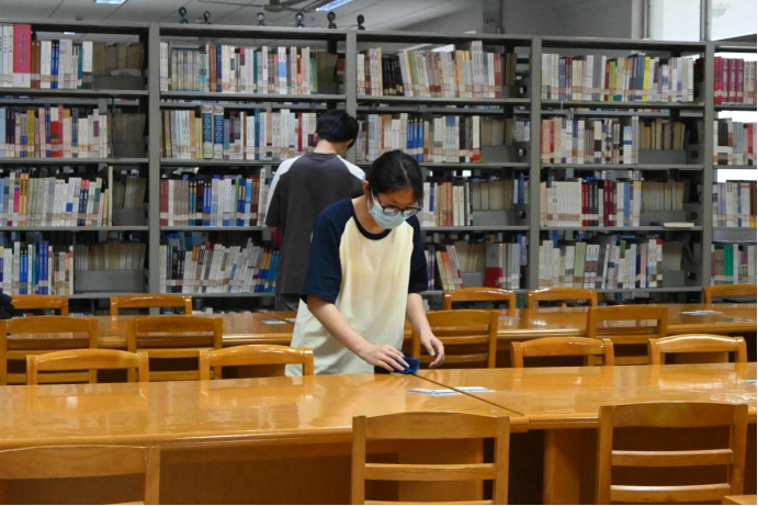 图书馆内,学员们手持扫把、抹布等劳动工具,在负责人的带领下明确分工,前往各自的指定区域,分组擦拭书架、打扫卫生、搬运分类并整理书籍。