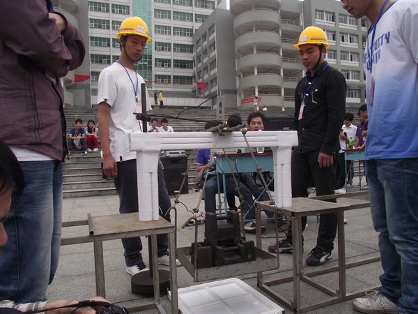 大赛于上午8:30开始,并由陈振富书记致开幕辞,总结了城市建设公司结构模型设计大赛的历史与成绩。本次比赛专业组有19个参赛队,首先评委对结构制作及造型打分,接着由工作人员开始进行现场加载试验。加载时,将50kg的重物加载到载物平台上,维持90秒,由计算机根据模型的质量、挠度等各项指标进行评定并打分。参赛的选手们敛声屏气,比赛过程扣人心弦。在一项项综合评定之后,最终来自道桥093班的6号作品“通霄吊”摘得桂冠,并设的还有二等奖2名、三等奖3名、优胜奖5名。最后,陈振富书记作大赛总结并举行颁奖仪式。