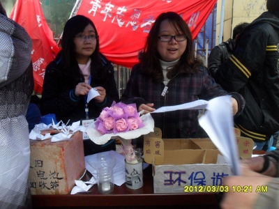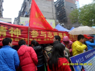 本次活动目的地是先锋街道社区。到达目的地后,队员们插好队旗,拉好横幅,冒雨向市民们发放资料宣传环保知识。雨棚内的队员则负责为同时进行的环保小游戏准备奖品。一位参与者谈到:“这样的活动应该经常举行。让老人和小孩参与其中,尤能让环保知识深入人心。”