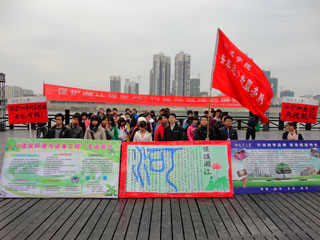 首先,我们在南华广场举行了启动仪式,在启动仪式上,老师对整个活动做了周密的安排,并强调了组织纪律。接着,我们沿常胜路、莲湖路、解放路开展了保护母亲河宣传活动。在湘江风光带大家通过宣传展板,传单以及自己的耐心介绍等各种手段积极向市民宣传保护湘江母亲河的紧迫性与重要性。在老师的带领下,我们全部参与者通过环湘江长跑,沿湘江捡拾垃圾,为湘江检测水质等一系列活动引起市民的注意,让大家真正意识到“保护湘江,人人有责”。虽然寒冬的湘江边冷风阵阵,但大家仍然情绪高昂,丝毫没有体验到寒冷的滋味。大家的热情鼓舞了周围的市民,有不少市民跑过来与我们交流,表示支持我们的活动,觉得这样的活动很有意义,能够在一定程度上增强市民的环保意识。当然,他们也向我们提出了一些宝贵的意见,我们热情地邀请他们在我们的宣传横幅上签名留念,他们爽快地签上了自己的名字。