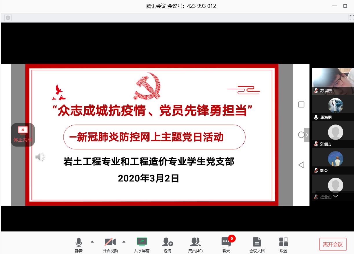 为深入学习习近平总书记在统筹推进新型肺炎疫情防控和经济社会发展工作部署会议上的讲话精神,统筹做好公司公司各项工作安排,beats365岩土工程专业和工程造价专业员工党支部于2020年3月2日下午通过腾讯会议平台开展了“众志成城抗疫情、党员先锋敢担当”线上主题党日活动,支部书记李翠新老师发起并主持会议,支部全体党员参加会议。