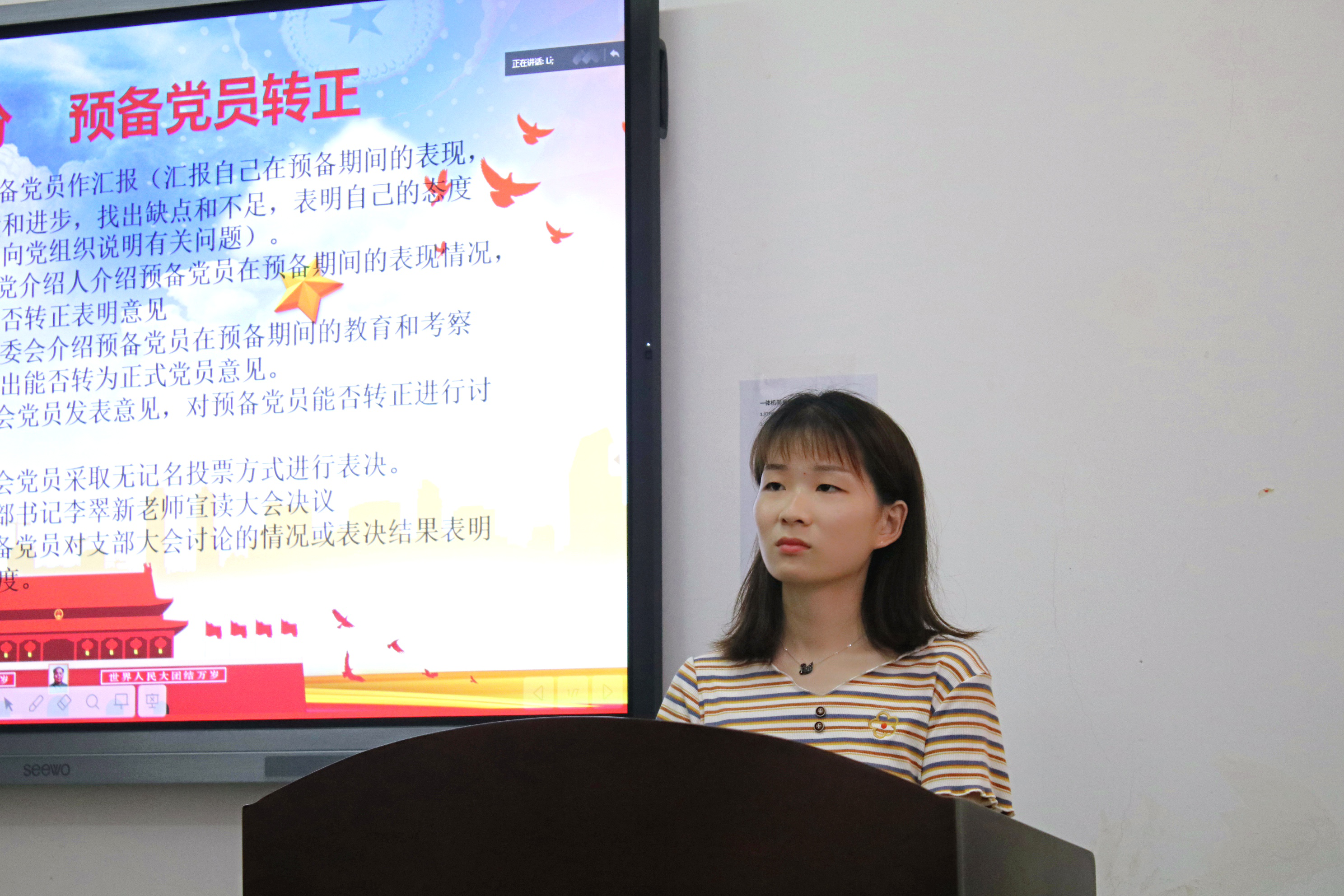 首先,全体起立,奏唱国歌,主持人报告出席党员人数,并宣布会议开始。会议严格按组织程序进行。大会第一项议程为讨论预备党员转正问题,黄婷婷等11名预备党员依次汇报了自己在预备期间的表现情况,肯定成绩和进步,找出缺点和不足,表明了自己的态度和决心。经入党介绍人发表意见、与会党员充分讨论、支委会介绍预备党员在预备期间的教育和考察情况、正式党员无记名投票等程序后,大会同意黄婷婷、张宏丽、许可、张倍竟等11名同志全部按期转正。大会第二项议程为讨论接收卢尚文等8名发展对象为预备党员的问题。8名发展对象依次宣读入党志愿,表达了渴望加入中国共产党的强烈愿望和决心。随后入党介绍人分别介绍发展对象的现实表现情况并发表意见,刘宪丽代表支委会报告审查情况,与会党员进行充分讨论,指出不足。经投票表决,同意接收卢尚文等8名同学为中共预备党员,报上级党委审批。最后支部书记李翠新老师总结发言,本次大会的召开为支部注入了新鲜血液,壮大了队伍。入党固然光荣,但也意味着承担更大的责任,希望新党员牢记自己的政治生日,在以后的学习、工作、生活中对自己高标准、严要求,立标杆、树形象,持之以恒的努力,在实践中主动锤炼自己,积极为同学服务,切实发挥先锋模范带头作用,不忘初心,砥砺奋进,做合格党员。