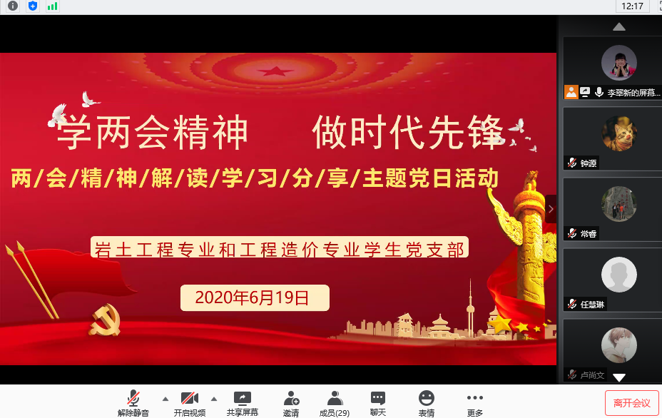 为认真学习贯彻落实两会精神,进一步深化员工党员对两会精神的认识与理解,强化员工的政治责任感和历史使命感,2020年6月19日下午,beats365岩土工程专业和工程造价专业员工党支部通过腾讯会议平台开展“学两会精神,做时代先锋”线上主题党日活动,活动由支部书记李翠新老师主持,支部全部党员参加。
