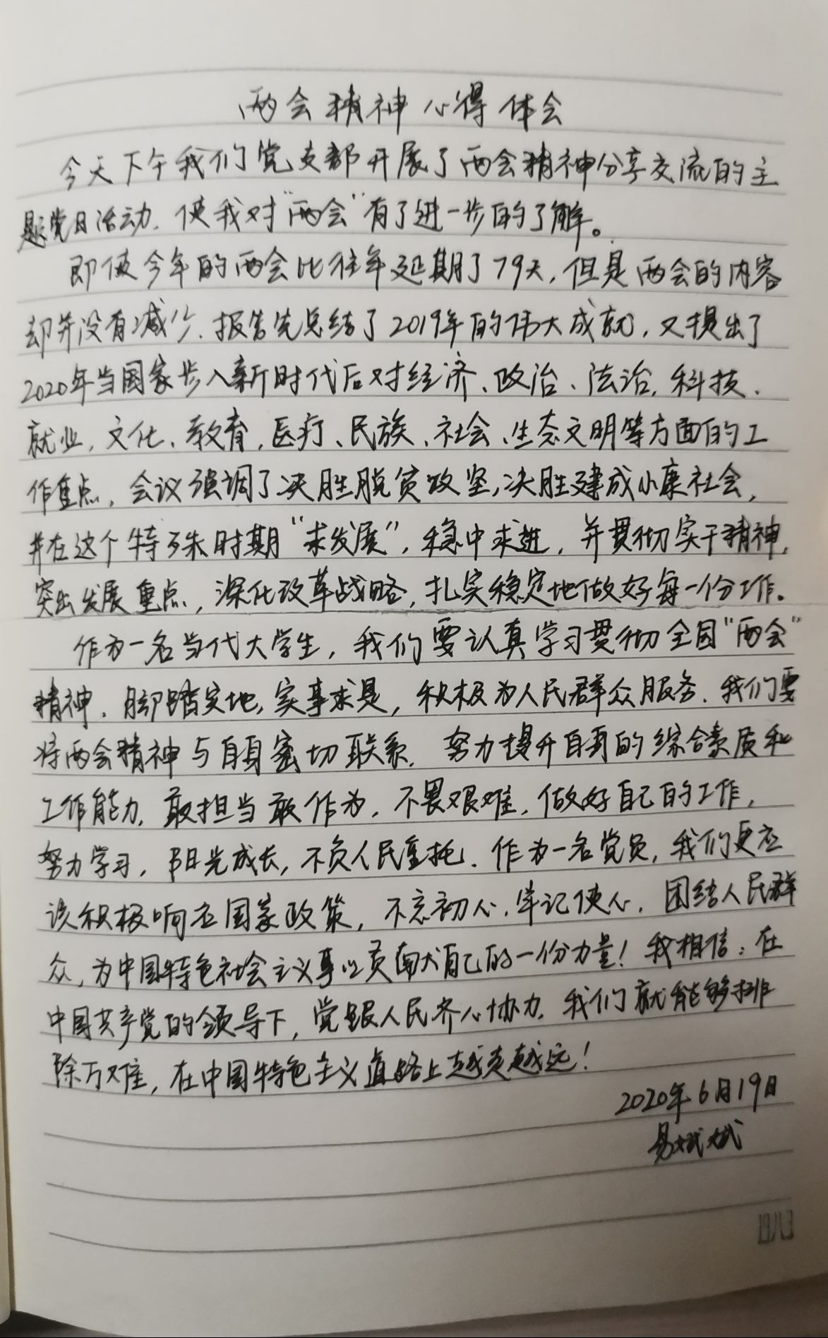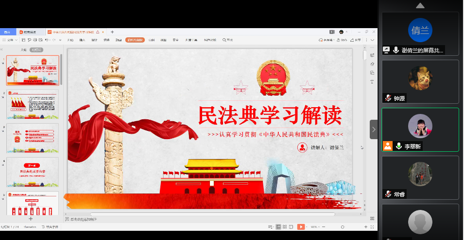 活动伊始,支部书记李翠新老师带领全体党员从认识两会开始,了解了2020年两会的不平凡。随后,刘璐瑶、李玉海、谢倩兰三位同志与大家分享了自己关于两会的学习内容和关注热点。他们分别围绕脱贫攻坚、政府工作报告、民法典等两会热点话题进行了解读学习与分享。会上,支部书记还认真组织学习了创建全国文明城市、国家卫生城市的有关要求和知识,讲解了“衡阳群众”APP操作使用知识,引导全体党员在今后的生活中积极参加志愿者活动,支持、参与创文创卫工作。全体党员按要求加入了“衡阳群众”公司团队。最后,李老师强调,全体党员要全方位多角度地继续学习、领会、贯彻两会精神,扬青春之气,发奋斗之力,以两会精神为指引,主动担当作为,努力学习,心怀家国,做新时代的新青年,为祖国建设献一份力。会后,全体党员围绕本次主题党日活动撰写心得体会。