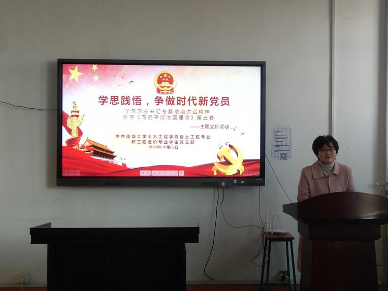 2020年10月22日下午14:30,beats365岩土工程专业和工程造价专业员工党支部在土木楼四楼会议室开展“学思践悟,争做时代新党员”主题党日活动,深入学习习近平总书记在湖南考察的重要讲话精神,集中学习《习近平谈治国理论》第三卷,活动由支部书记李翠新老师主持,支部全部党员参加。