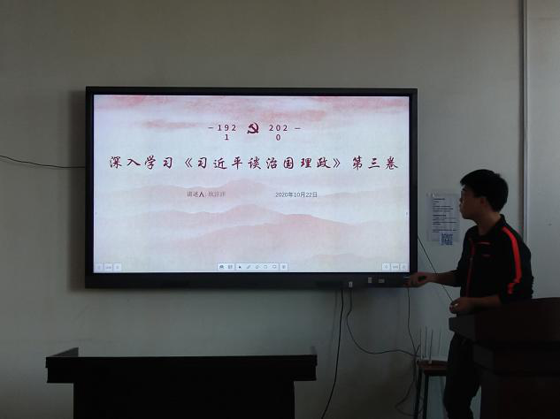 集中学习环节通过党员领学形式开展,领学党员先自己学,带着责任学;再自己讲,带着使命讲。唐佳妮、庞泽威、欧洋洋三名党员通过精心制作的PPT带领全体党员分别学习了习近平总书记在湖南考察的讲话精神、解读了《习近平谈治国理政》第三卷的出版背景、基本情况及主要内容。随后,与会党员进行学习分享,交流心得体会,在思想碰撞中领会精神实质,在学习中思考,在思考中提升。最后李老师总结到:希望大家做到学用结合,学做结合,知行统一,争做新时代好党员。牢记习近平总书记对青年的期望和嘱托,珍惜当下,把握好每一天,不负青春立大志,不负韶华勤奋斗,不负时代勇于担当!