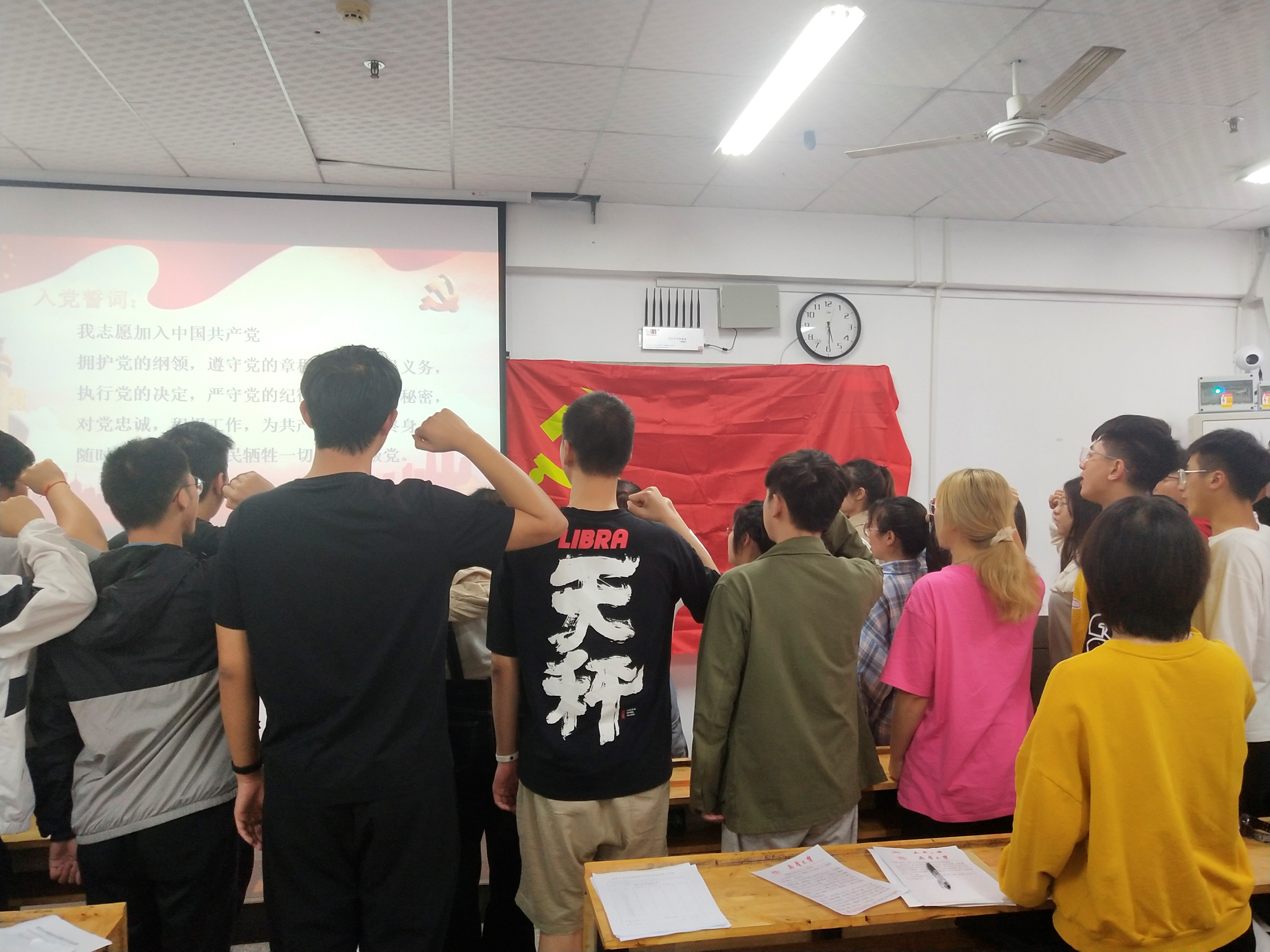 会议伊始,向金晶同志对本次会议进行说明并介绍会议流程。会议第一项,奏唱国际歌。礼毕,会议进行第二项,由廖亦枓、黄达等25名同志依次就自身个人情况、对党的认识、入党动机等方面进行相关发言,并由其入党介绍人介绍其相关情况,对其能否吸收入党发表意见。随后,正式党员对该25名发展对象是否吸收入党进行投票表决。根据投票结果,同意吸收廖亦枓、黄达等25名同志为中共预备党员。接着,袁彬同志带领全体党员重温了入党誓词。最后,贺老师作会议总结,贺老师首先表达了对本次新吸收的预备党员的鼓励与认可,接着对全体党员提出要求,作为党员要时刻树立先锋模范作用,要有责任感,在日常生活中主动担当,从群众中来,到群众中去,并树立终身学习理念,学好专业知识,规范做事,严谨做人,希望各位党员同志共同成长,共同进步。