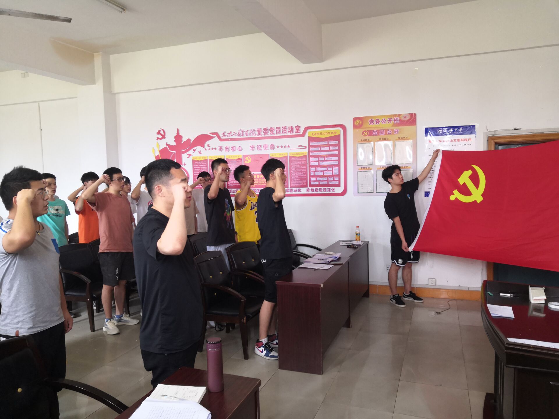 会议第四项,重温入党誓词。在支部书记彭兴明老师的领誓下,与会党员庄严地举起右手,面向党旗,共同重温入党誓词。高昂嘹亮的宣誓声凝聚起不忘初心的信念与力量。