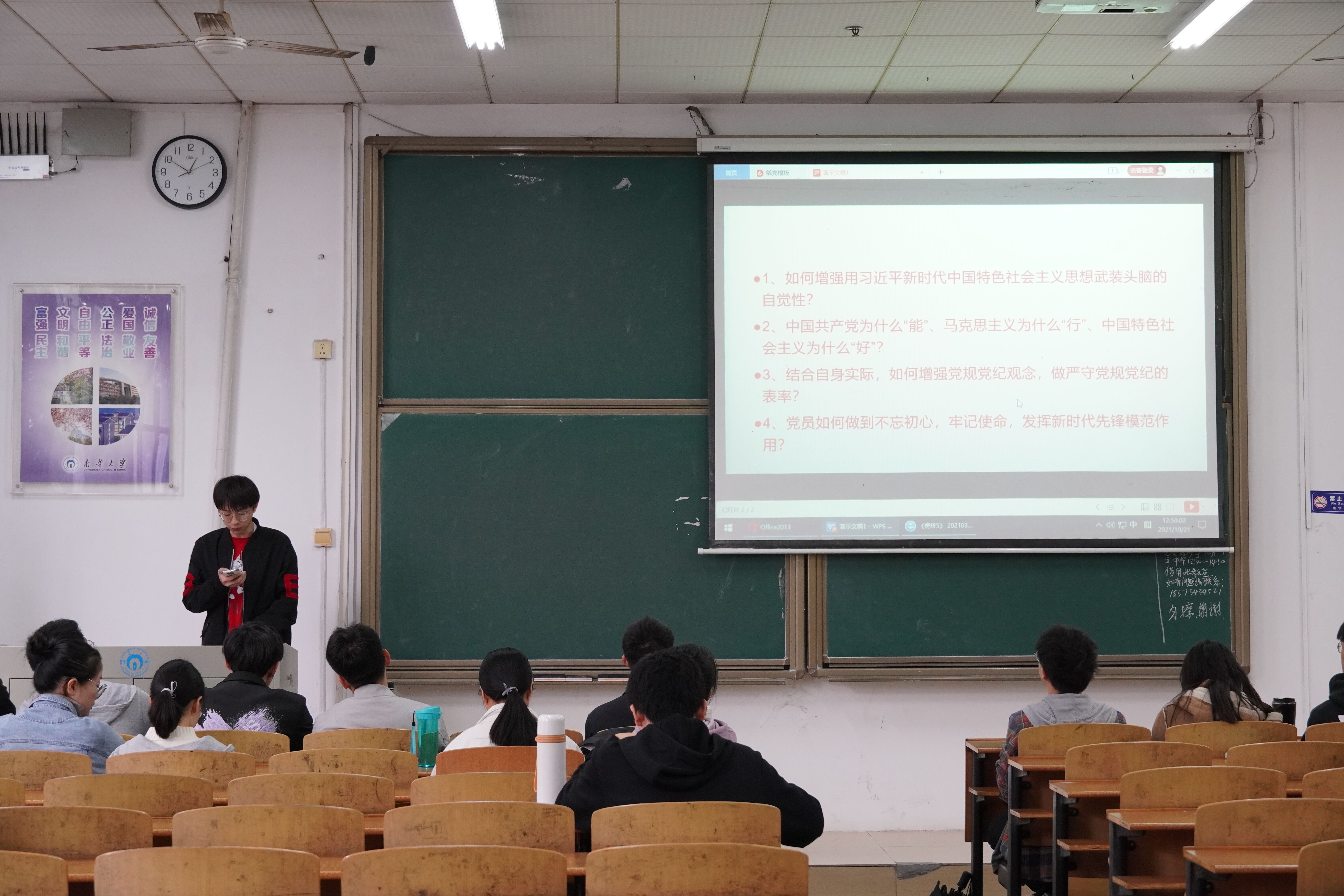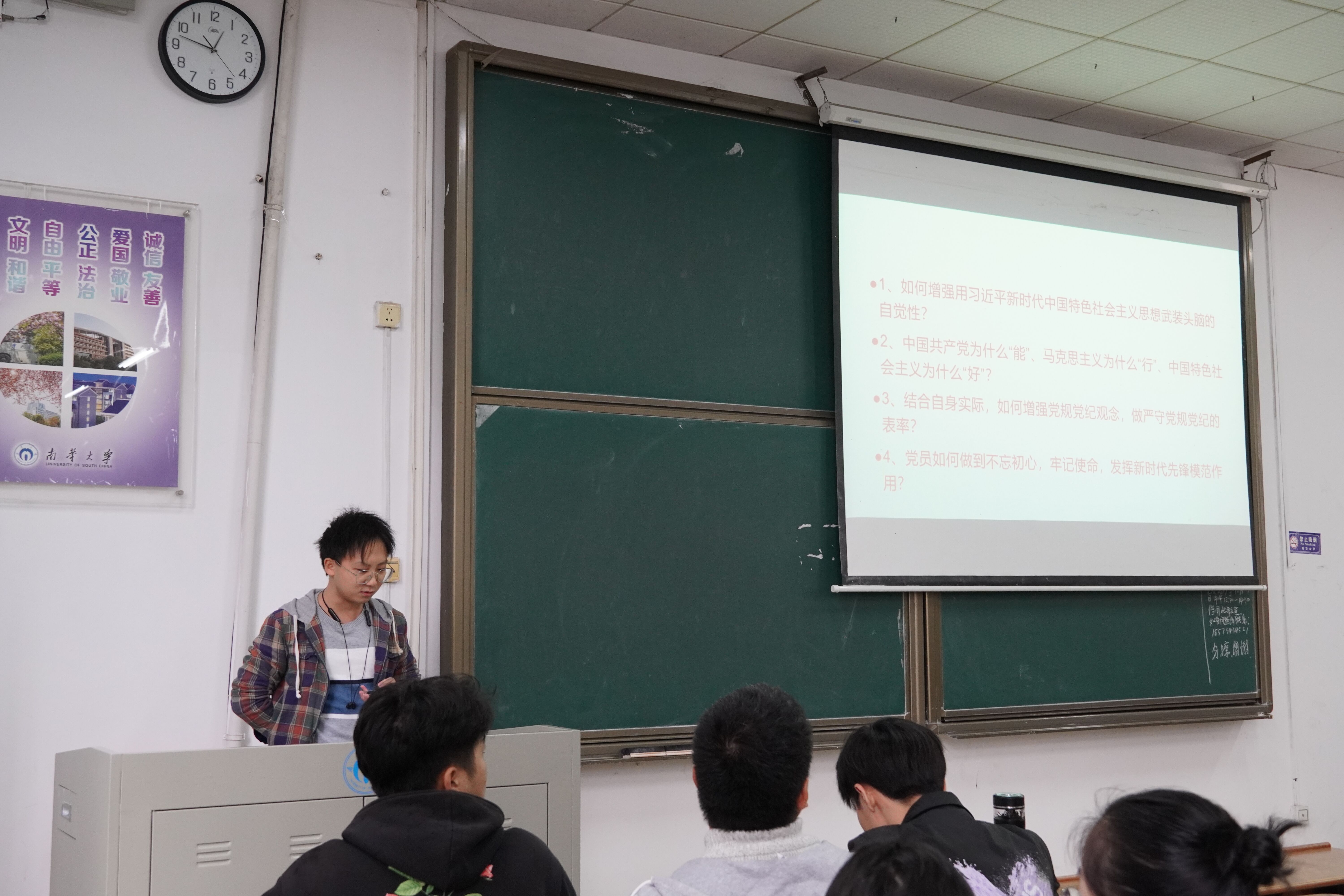 会议伊始,李玉海同学就党组织最新思想展开详细说明,并引出此次专题讨论的四个问题——“如何增强用习近平新时代中国特色社会主义思想武装头脑的自觉性”“中国共产党为什么‘能’、马克思主义为什么‘行’、中国特色社会主义为什么‘好’”“结合自身实际,如何增强党规党纪观念,做严守党规党纪的表率”以及“党员如何做到不忘初心,牢记使命,发挥新时代先锋模范作用”。各位学员结合党的理论知识和自身实际,针对四个问题展开激烈讨论,现场讨论气氛活跃。接着,各党支部学员代表上台发言,分享自己的心得体会。会议最后,由李玉海同学作思想感悟总结,他提出共产党人应坚定理想信念、为民实干担当、勤勉敬业奉献,勇挑实现中华民族伟大复兴的重担,起到模范带头作用。