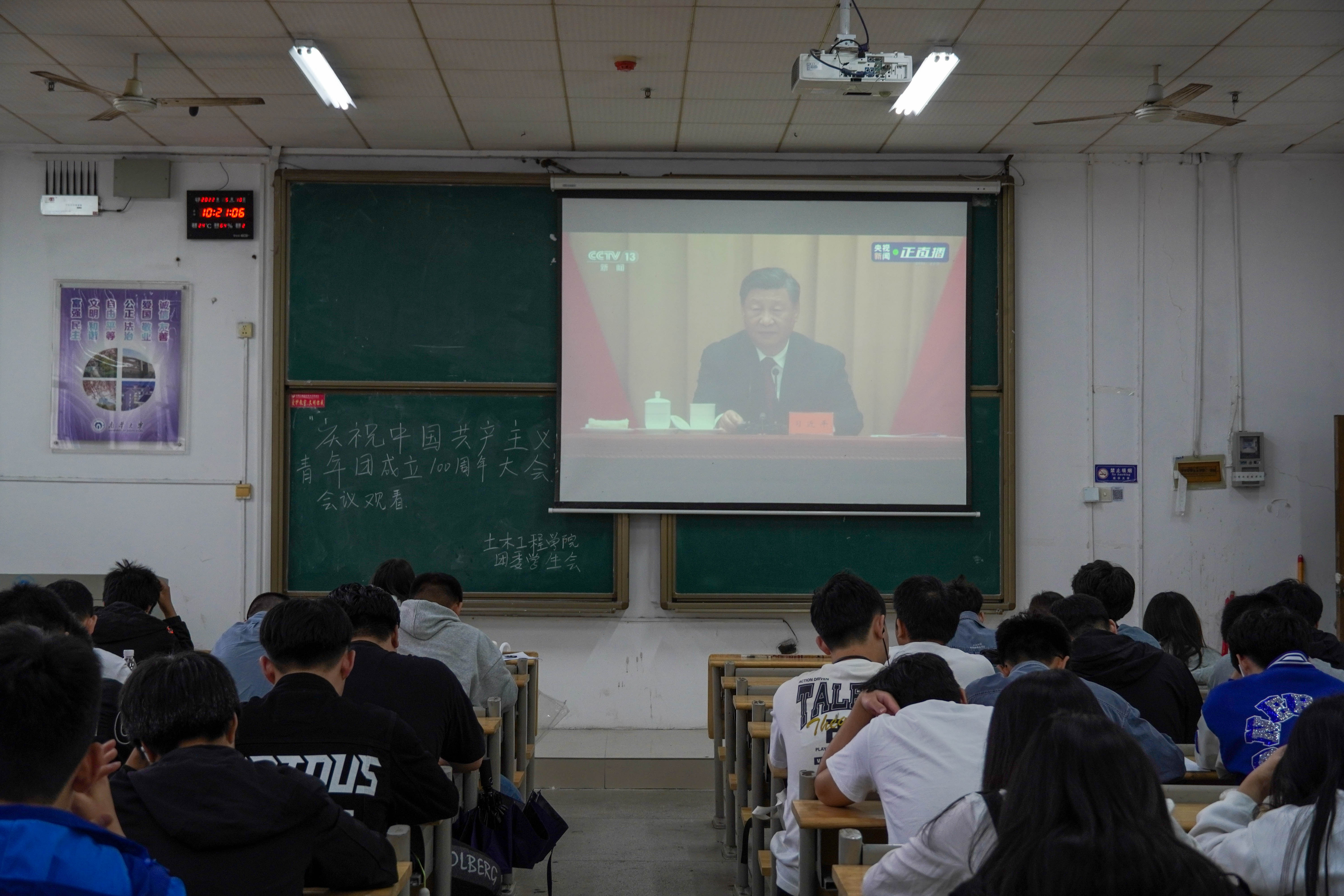 本次庆祝中国共产主义青年团成立100周年大会在北京人民大会堂隆重举行。庆祝大会上,共青团中央书记处第一书记贺军科发言,中华全国总工会党组书记、副主席、书记处第一书记陈刚代表人民团体发言。习近平总书记发表重要讲话,回顾了中国共产主义青年团跟党走、听党话的百年奋斗历程,为中国青年运动擘画了新的未来,为中国青年提出了奋进新时代的新要求、新期待。习近平总书记强调:“新时代的广大共青团员,要做理想远大、信念坚定的模范;要做刻苦学习、锐意创新的模范;要做敢于斗争、善于斗争的模范;要做艰苦奋斗、无私奉献的模范;要做崇德向善、严守纪律的模范。”现场观看直播实况的同学们认真专注,感触颇深。