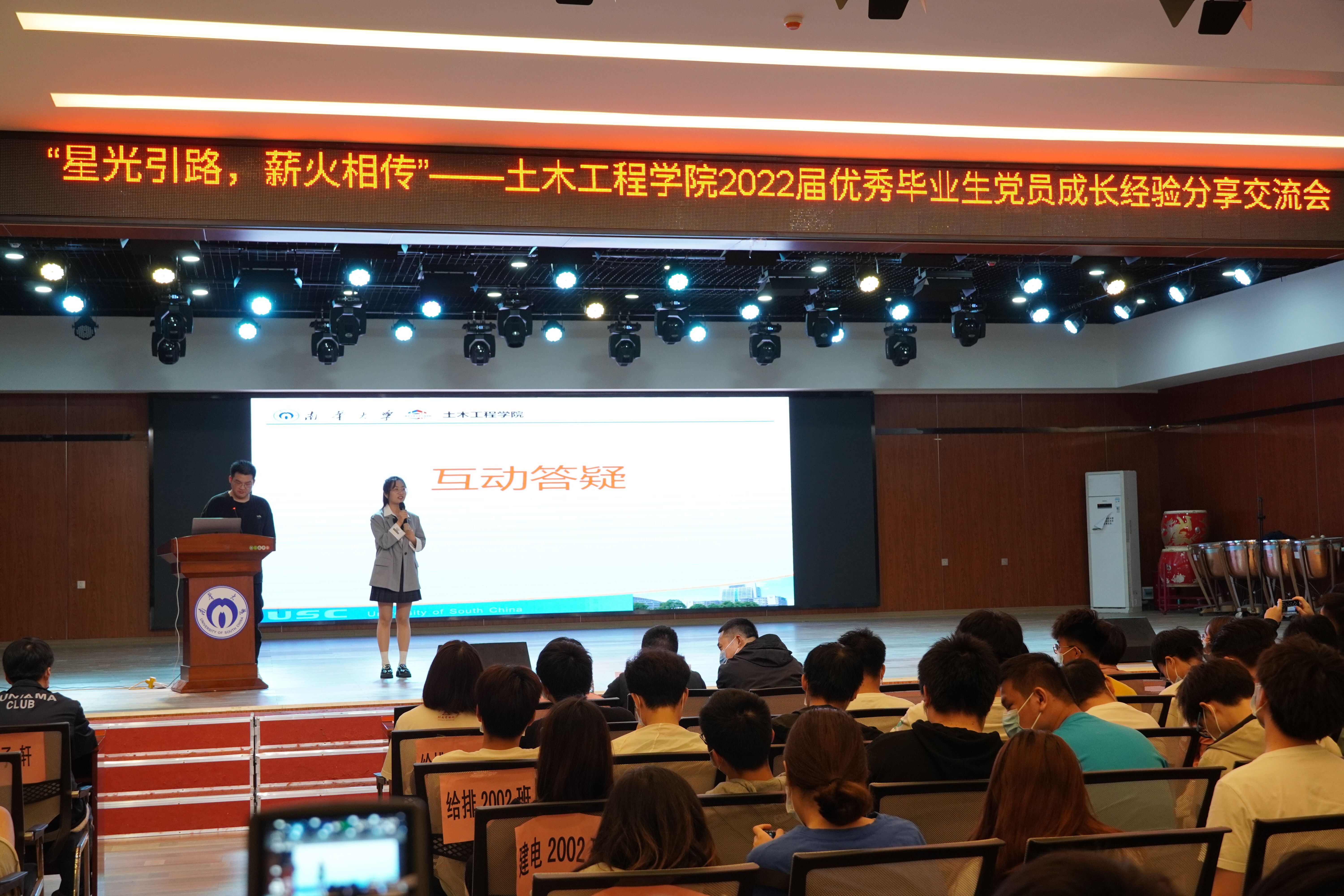 两位优秀毕业生党员代表分别从成长历程和心得建议两方面讲述自己在活动及工作中的磨砺,分享平衡工作与学习的宝贵经验。首先,朗颖学姐向大家重点分享了科研比赛相关知识,分析了土木工程专业的职业发展方向,介绍了部分就业单位及就业方面的知识。随后,刘裕龙学长向大家介绍了大学四年各个阶段的主要任务和考研所需要做的准备,并鼓励同学们在大学走出寝室,健康生活。会议最后,同学们借助互动答疑环节积极提问,学长学姐们针对问题,耐心解答。至此,本次优秀毕业生党员成长经验分享交流会圆满结束。
