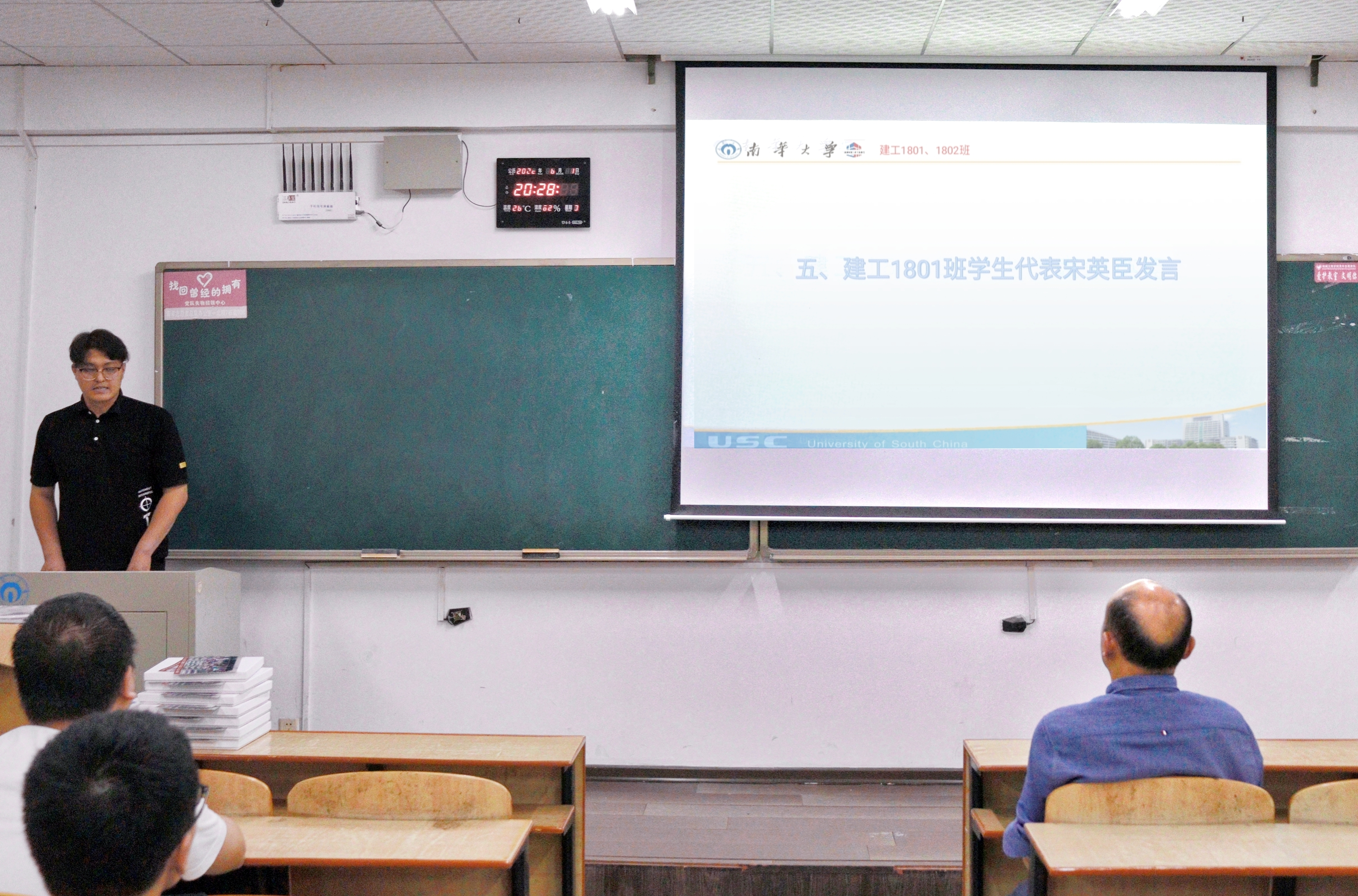 班会第二环节,两名员工代表上台发言。建工1801班宋英臣发言中表示,感谢大学四年里各位老师的栽培以及同学们的陪伴,并与同学们分享了自身实习工作的经验,希望大家保持终身学习的态度,坚定信念,不忘初心,继续发扬土木人“砖瓦造福、求实求真”的精神,在新的起点继续为理想努力奋斗。建工1802班梁逸锐则结合自身经历给出了三点建议:第一,要把专业知识和技能与社会实践相结合;第二,要学以致用,不断增强自身技能;第三,要勇于担当,用实际行动为建设社会主义现代化强国贡献力量。