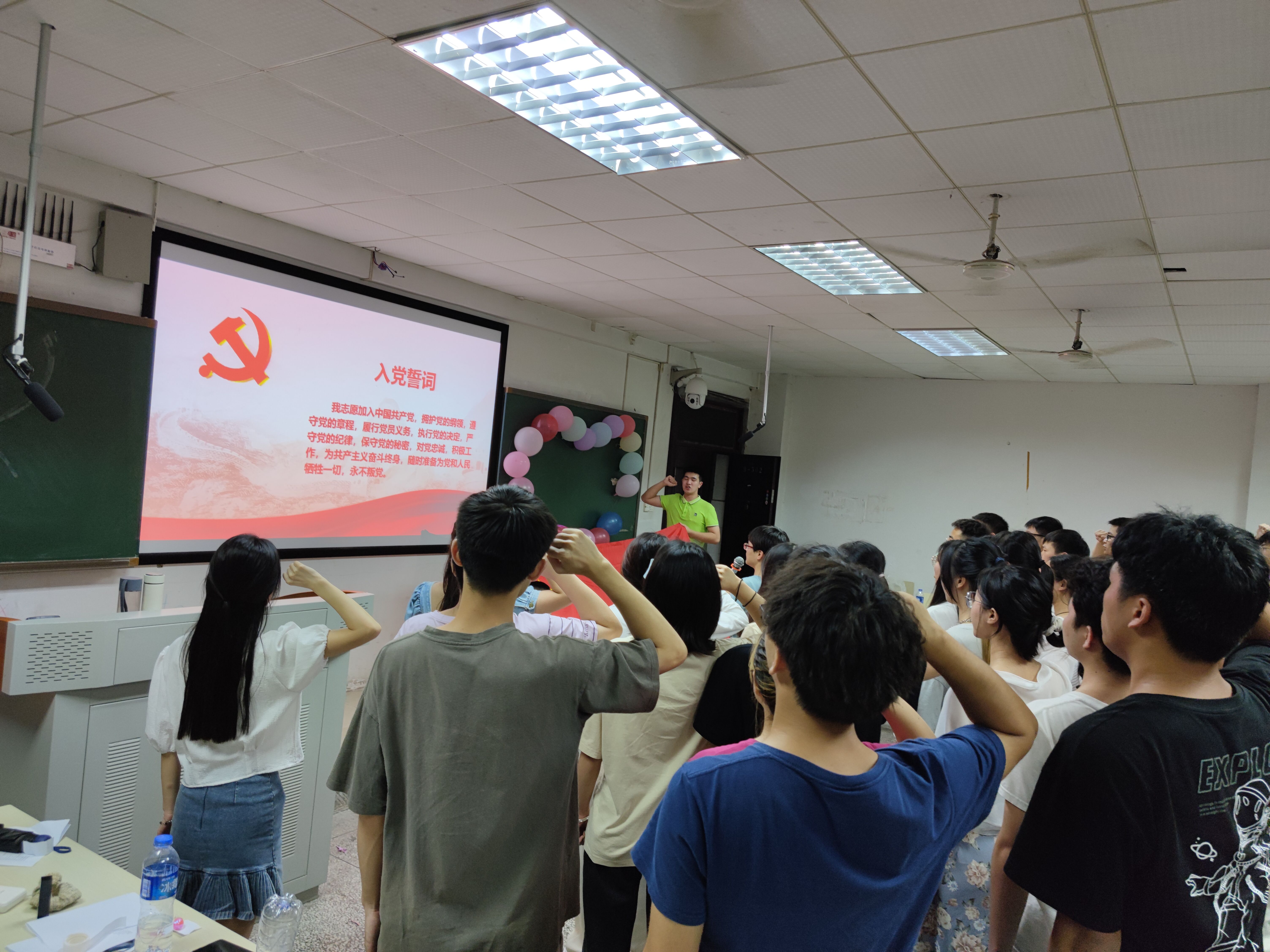 最后,新党员宣誓,老党员重温入党誓词,在第二党支部书记李老师的领誓下,全体党员面向党旗,举起右手庄严宣誓,慷慨激昂,对党和人民作出庄严承诺。至此,会议圆满结束。