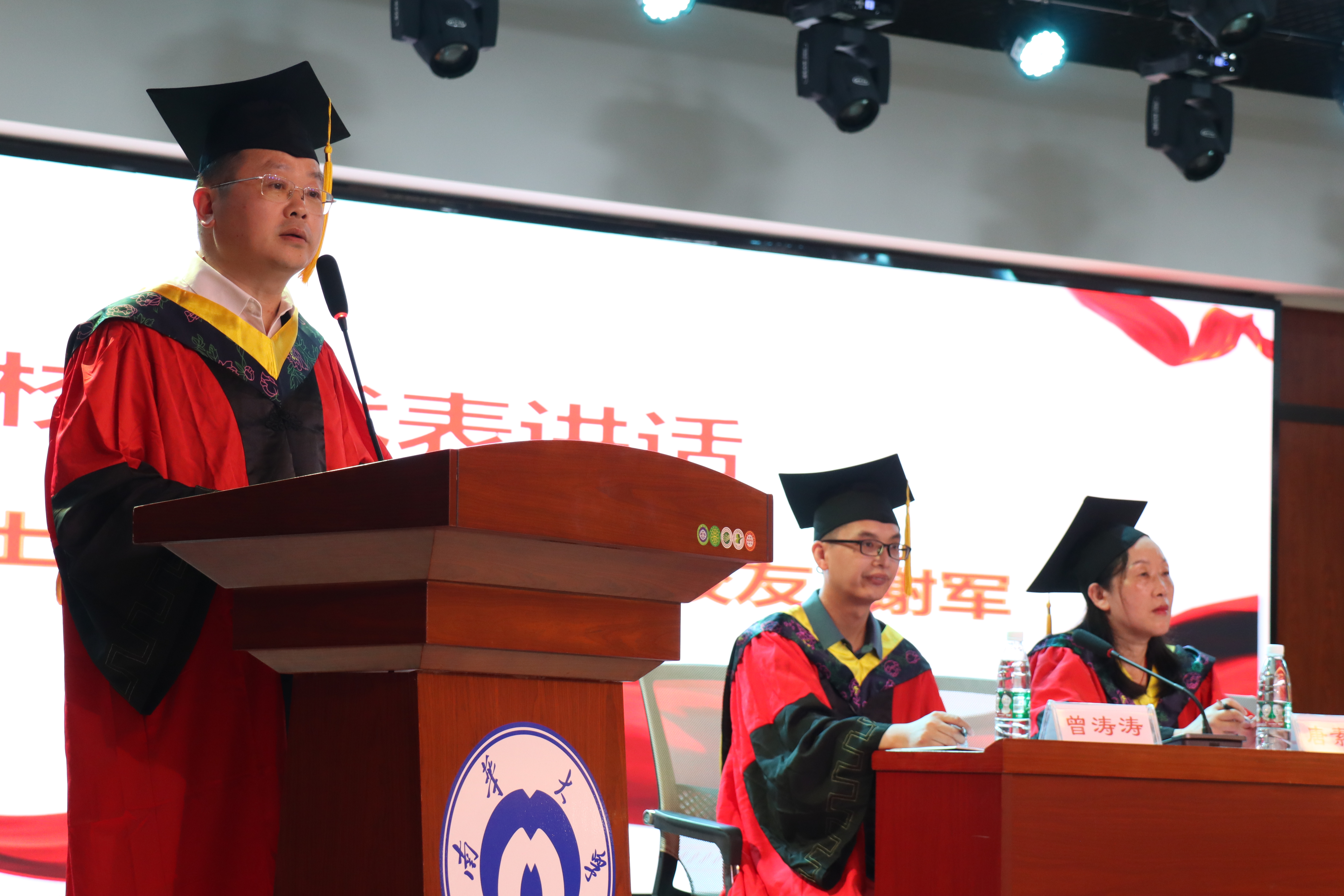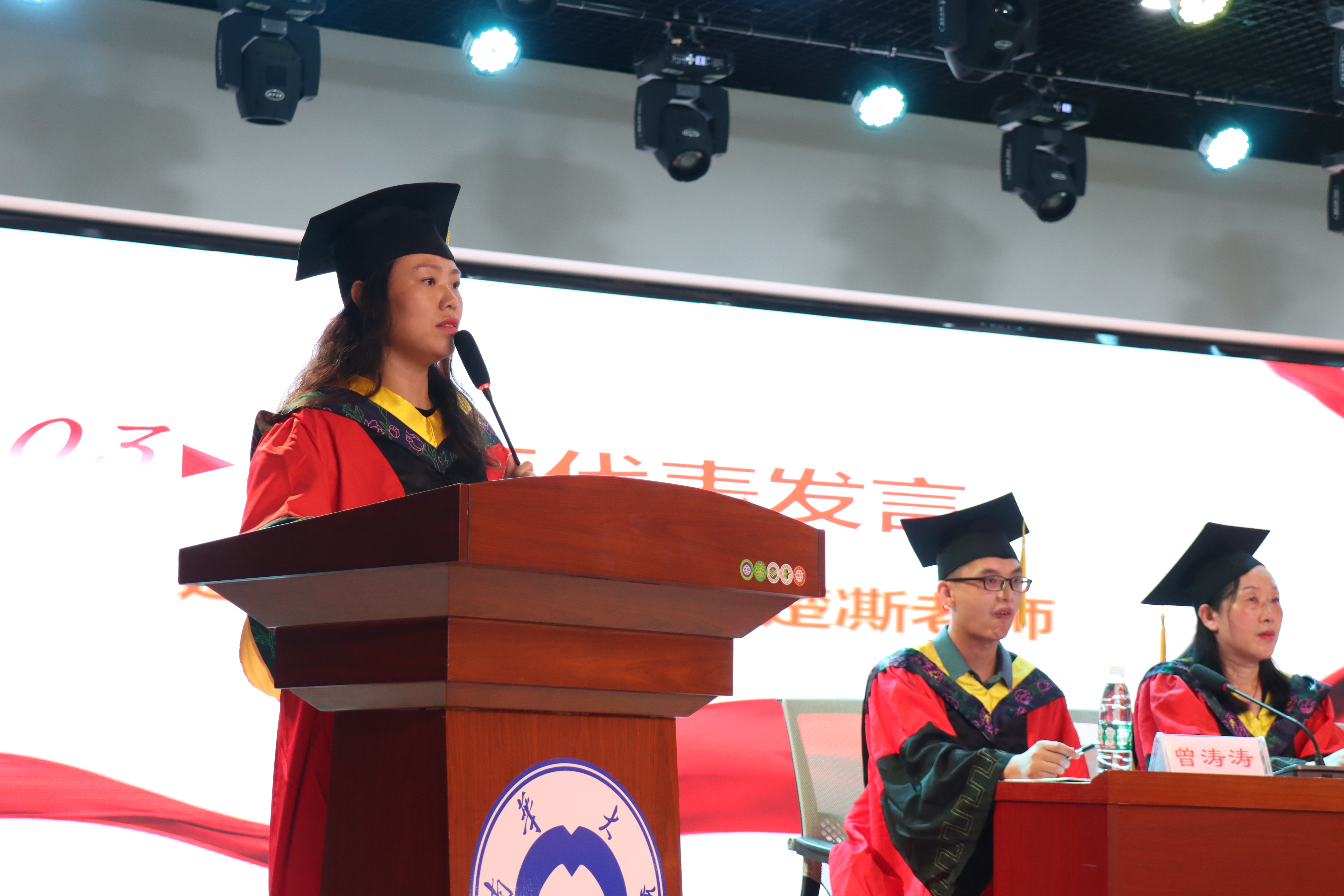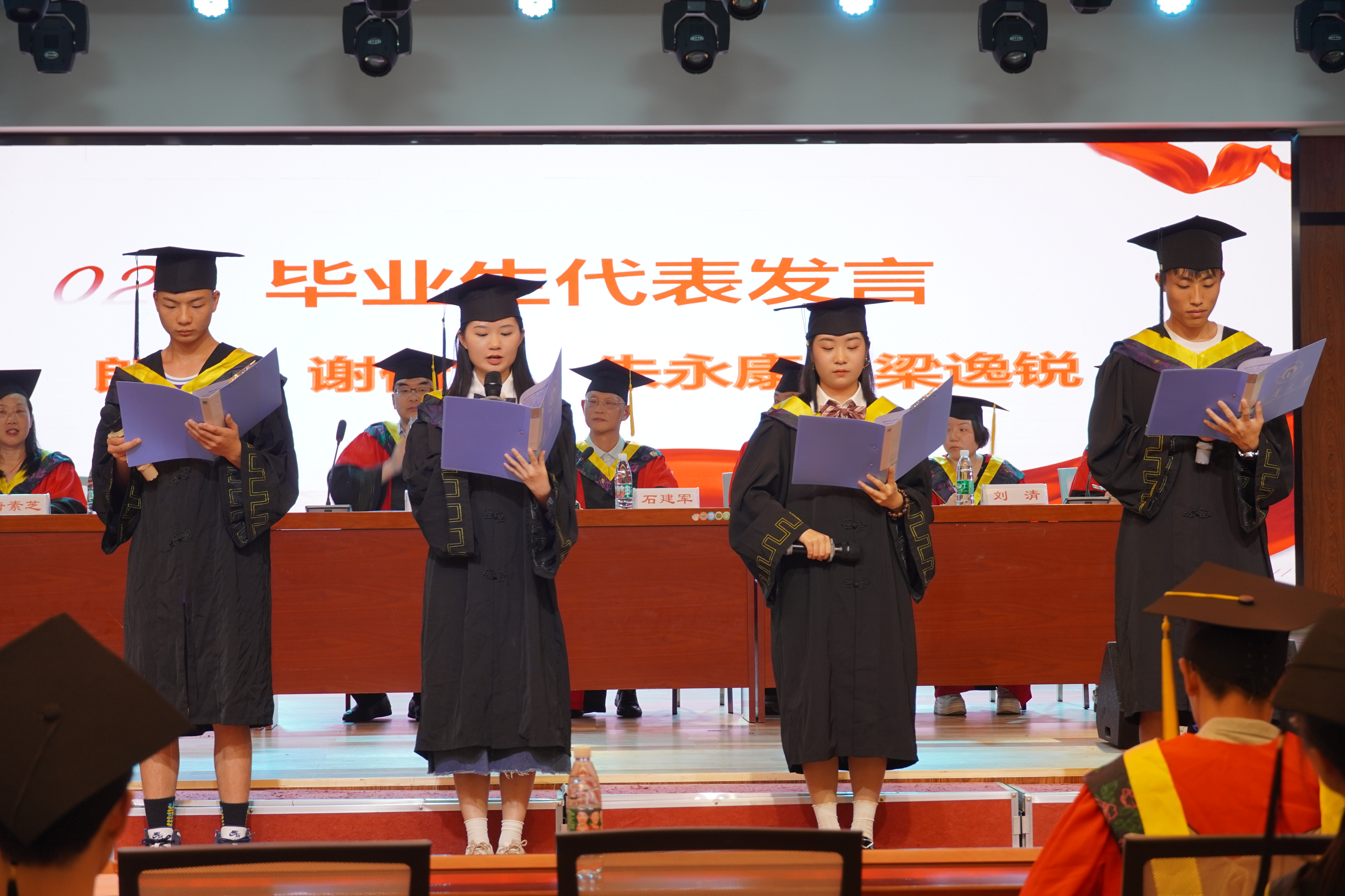 随后,毕业生代表郎颖、谢倩兰、朱永康、梁逸锐上台发言。他们分享了自己的成长历程,对母校与恩师表示衷心的感激与不舍,对未来生活表示美好憧憬,并祝愿母校再创辉煌,全体毕业生们前程似锦。