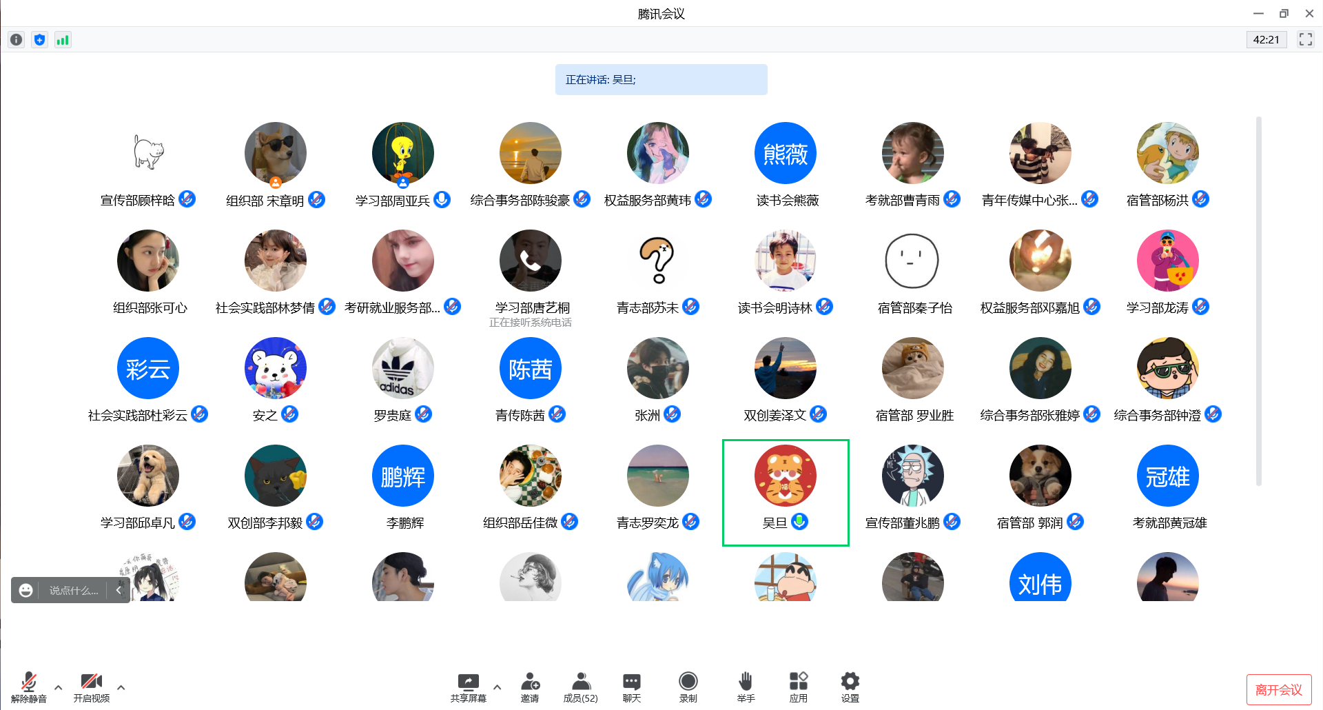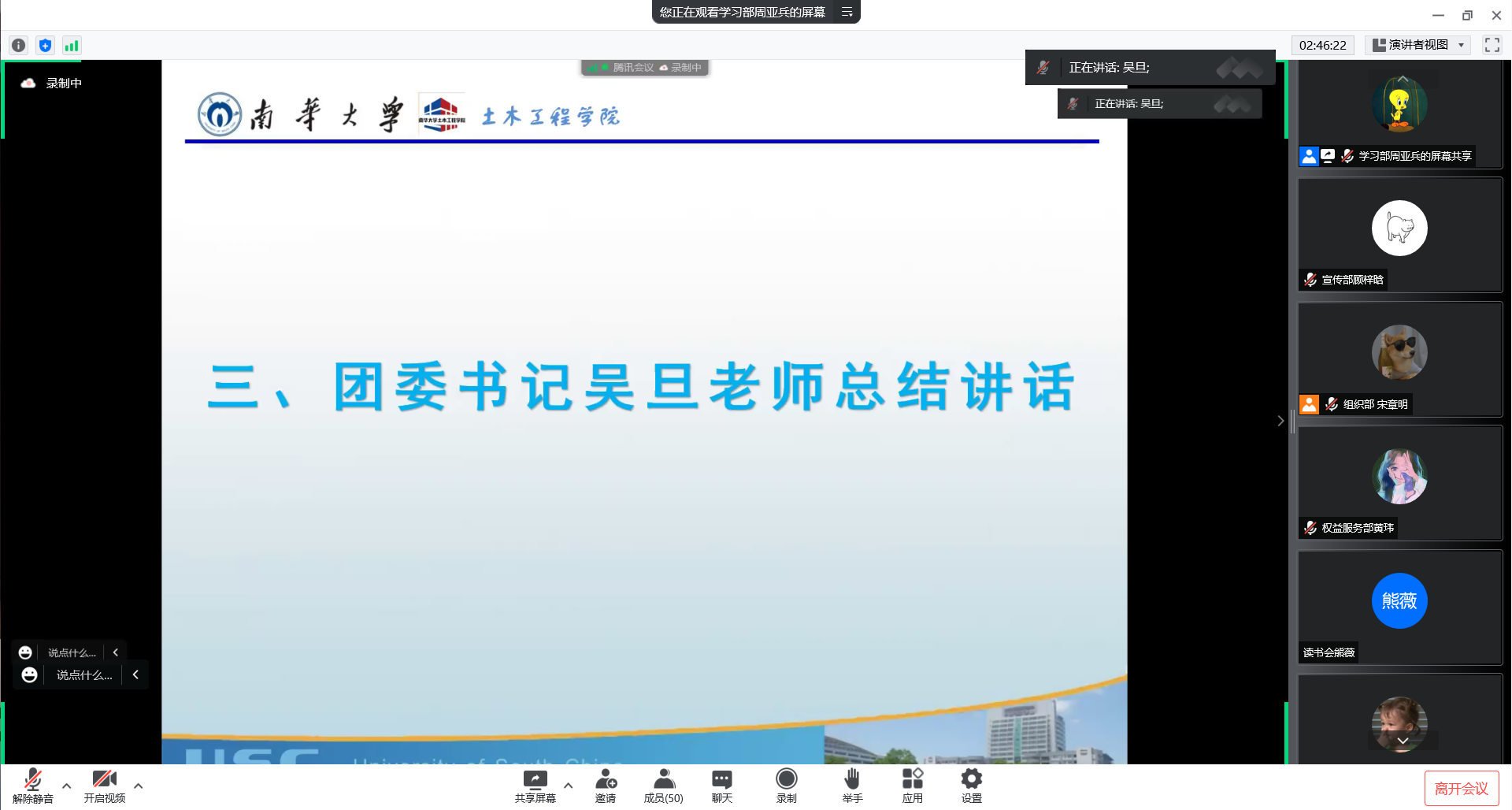 会议最后,吴旦发表总结讲话。他针对以上各部门的汇报情况,指出了“三不够,三不到位”的问题,提出了修改建议,规划了各部门暑期工作;希望各部门要树立责任心、锻炼工作能力、及时修改问题,做到工作学习两不误;同时对各部门一学年的辛勤付出表示感谢!至此,本次会议圆满结束。