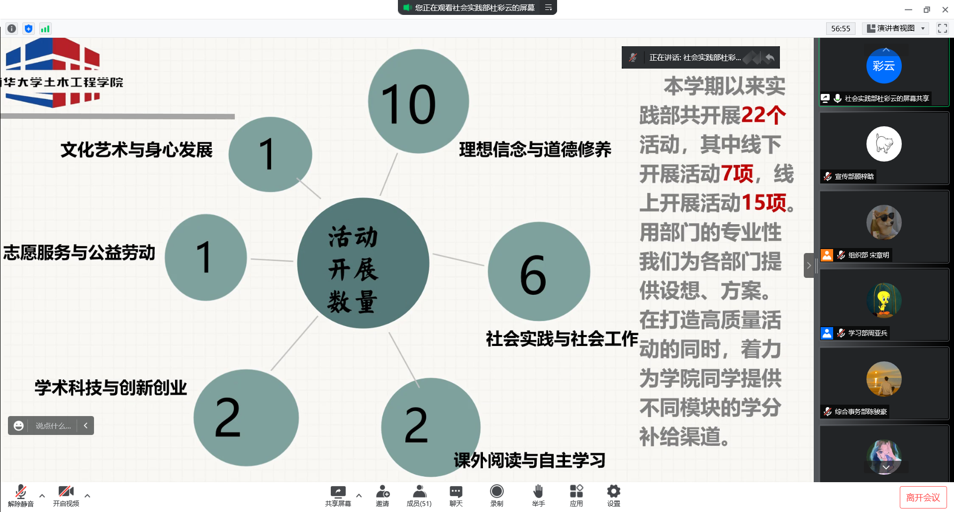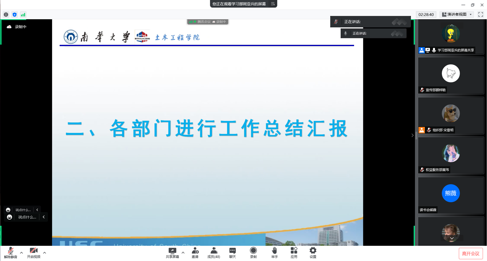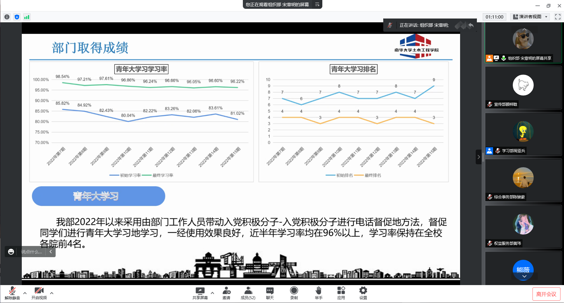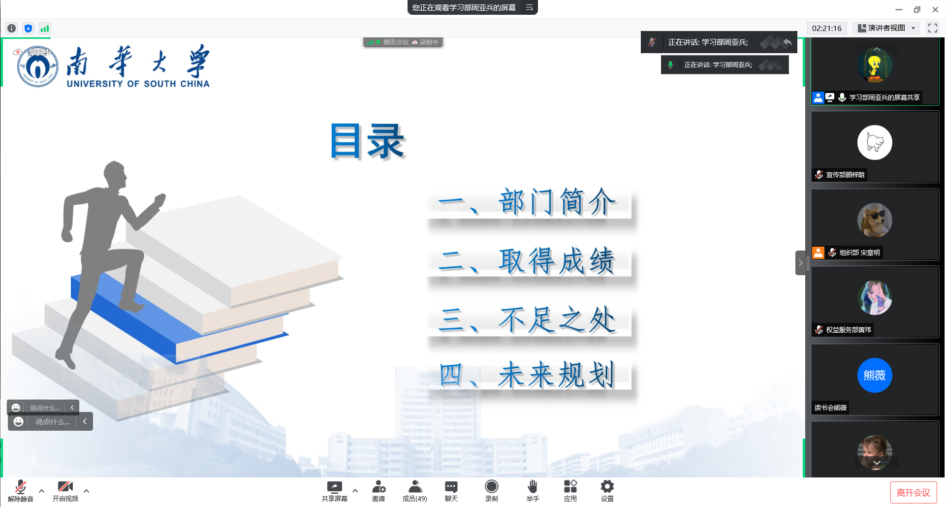 会议第二项,各部门按顺序作学年工作汇报。各部门汇报人通过ppt讲解,以图文结合的形式,讲解了部门概况,总结了一年来的工作成果,明确了部门不足之处,针对性地提出了后期规划。