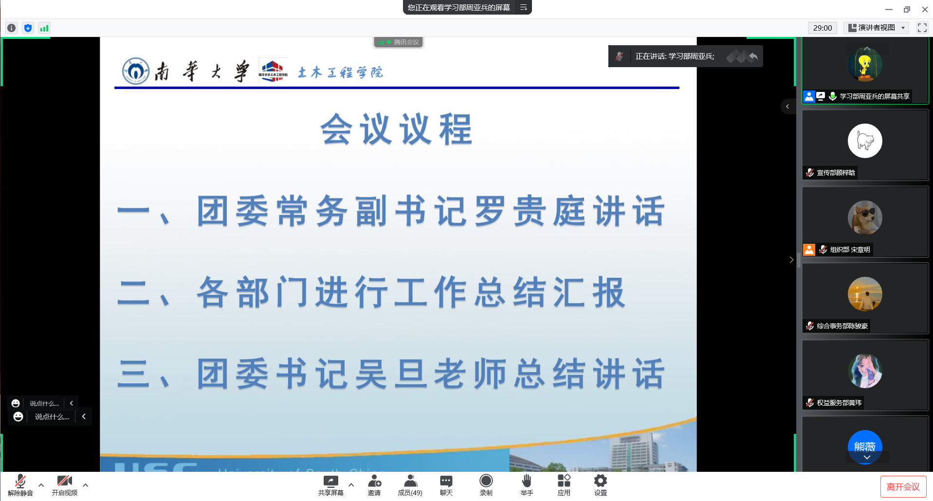 会议伊始,院团委常务副书记罗贵庭讲话。他对一学年内各部门所开展的工作及获取的成就致以肯定,对团干暑假期间的工作进行部署规划,并希望大家在暑期做好反思总结,充分准备新学期开学工作。