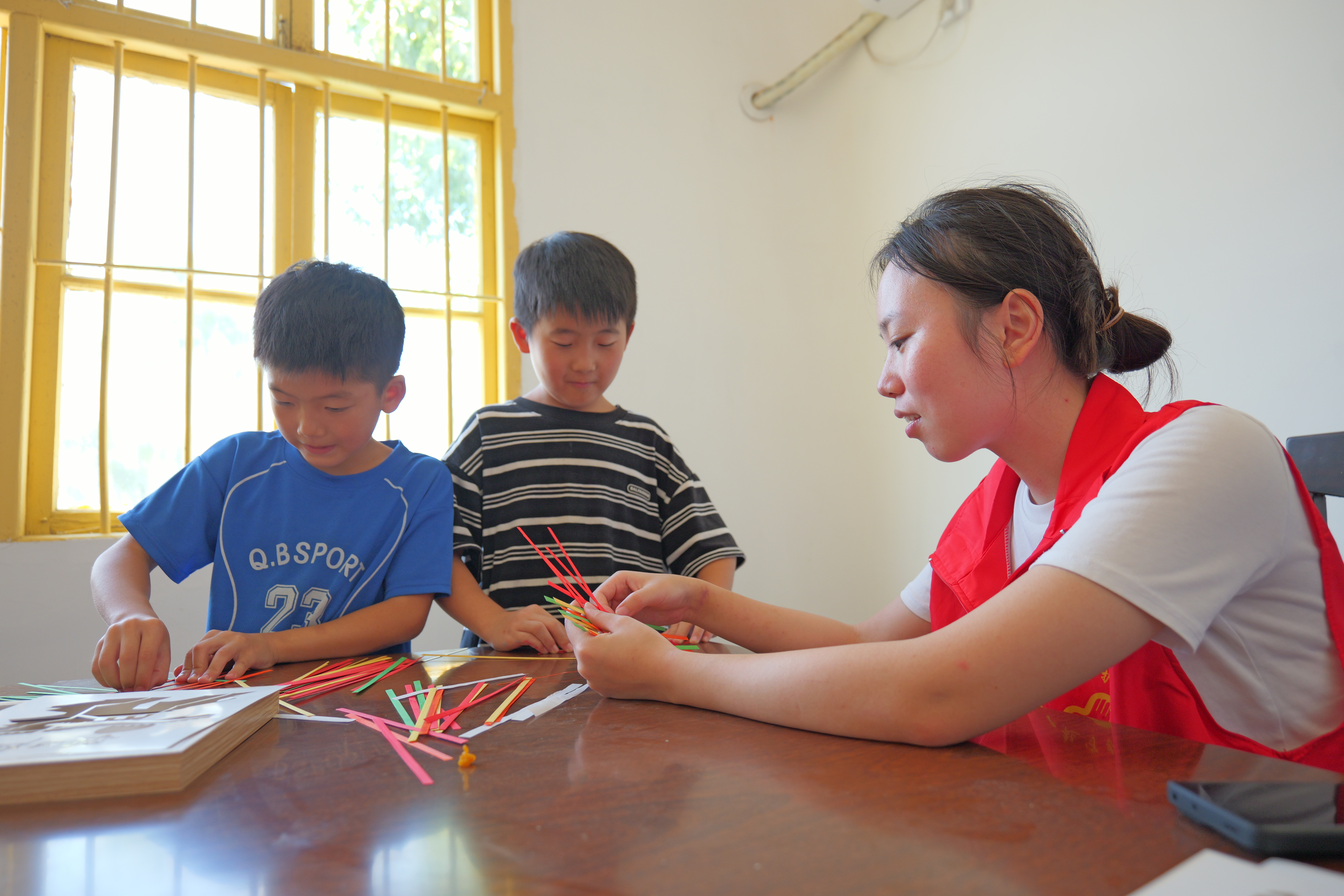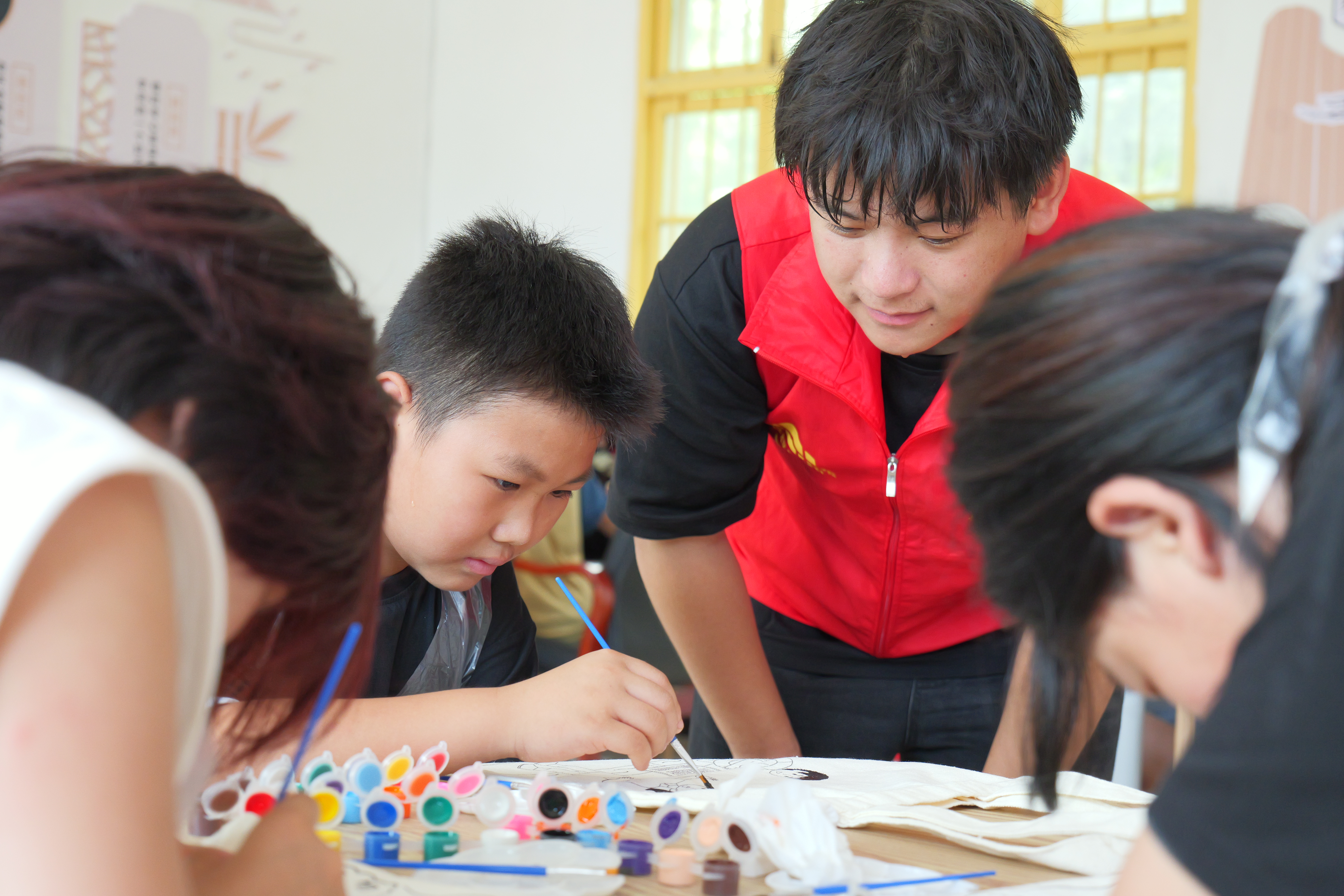 当天,志愿者们来到白云村农家书屋,与25名乡村少年儿童一起,手持画笔,勾勒线条,仔细涂色,进行曼陀罗创作和防溺水宣传帆布包涂色。