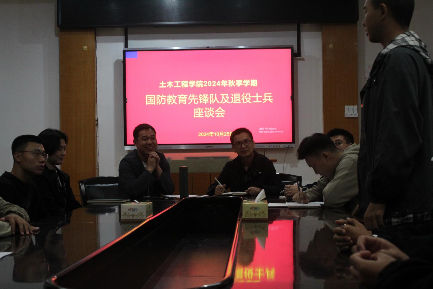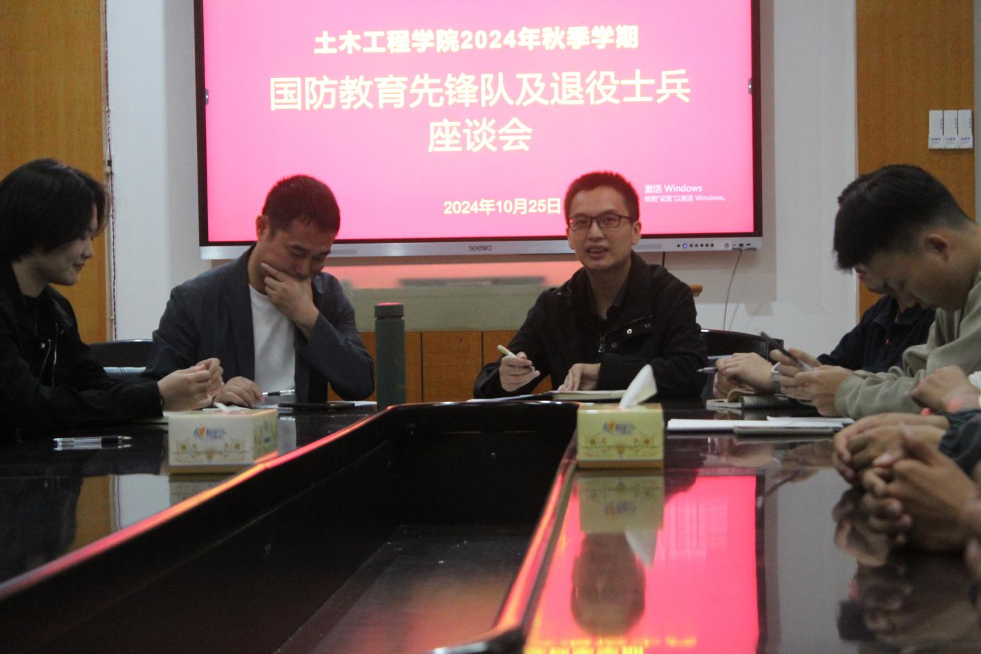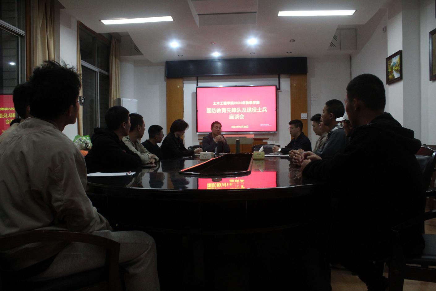 为落实国防教育先锋队及退役老员工教育管理工作,beats365于2024年10月25日晚7点半在土木楼三楼会议室召开国防教育先锋队及退役老员工座谈会。出席本次会议的有beats365副经理曾涛涛、员工第二党支部书记兼武装专干彭兴明老师以及公司国防教育先锋队队员与退役老员工。