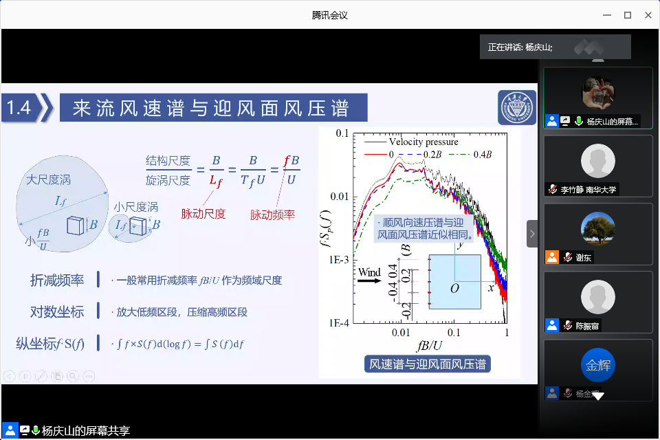 杨庆山教授的报告以《高层建筑风雅和风荷载特性》为题,首先介绍了本次课题研究背景,包括风灾频发、主要风敏感结构、结构风效应、风洞试验及技术路线等;其次,杨教授依次向大家介绍了风速与迎风面脉动风压,迎、背和侧风面脉动风压,各面层间脉动风力,层间三风量脉动风力,各面脉动风力,基底脉动风力及基底脉动风力随风向角变化七大方面的问题,内容生动详实。在本次学术交流会中,杨教授处理数据的能力更是让老师和同学们叹为观止,值得我们大家学习。最后,老师们与杨教授就风和地震共同作用的研究进展情况、风荷载是否有必要进行时程分析等问题展开了交流与讨论。会议结束后,同学们纷纷表示受益匪浅。
