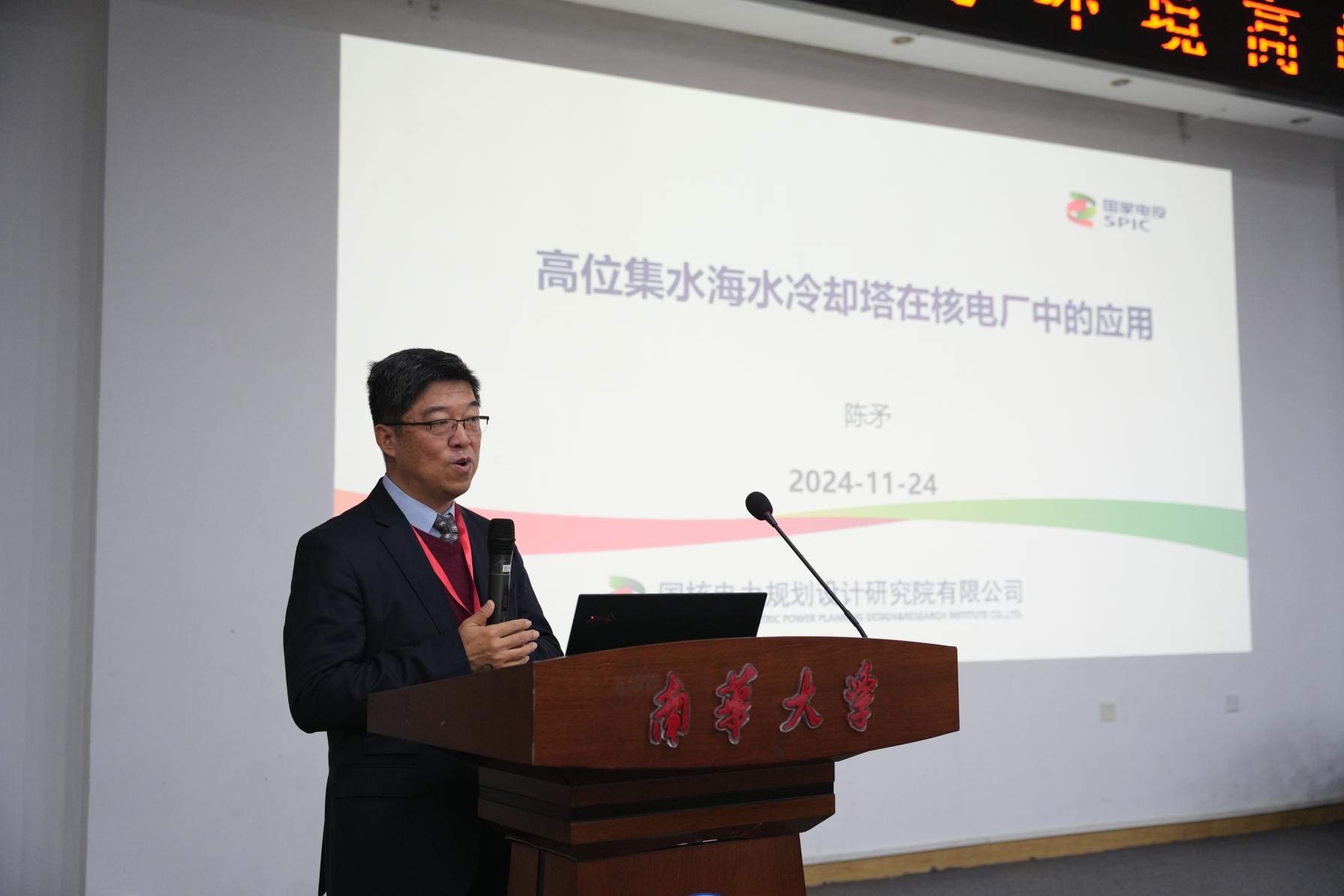 大会上,陈矛教授详细介绍了高位集水海水冷却塔在核电站中的设计、应用及未来发展方向。分析了沿海地区使用海水直接冷却的经济效益与环境影响。最后,陈教授表达了对土木和环境学科发展越来越好的美好祝愿。