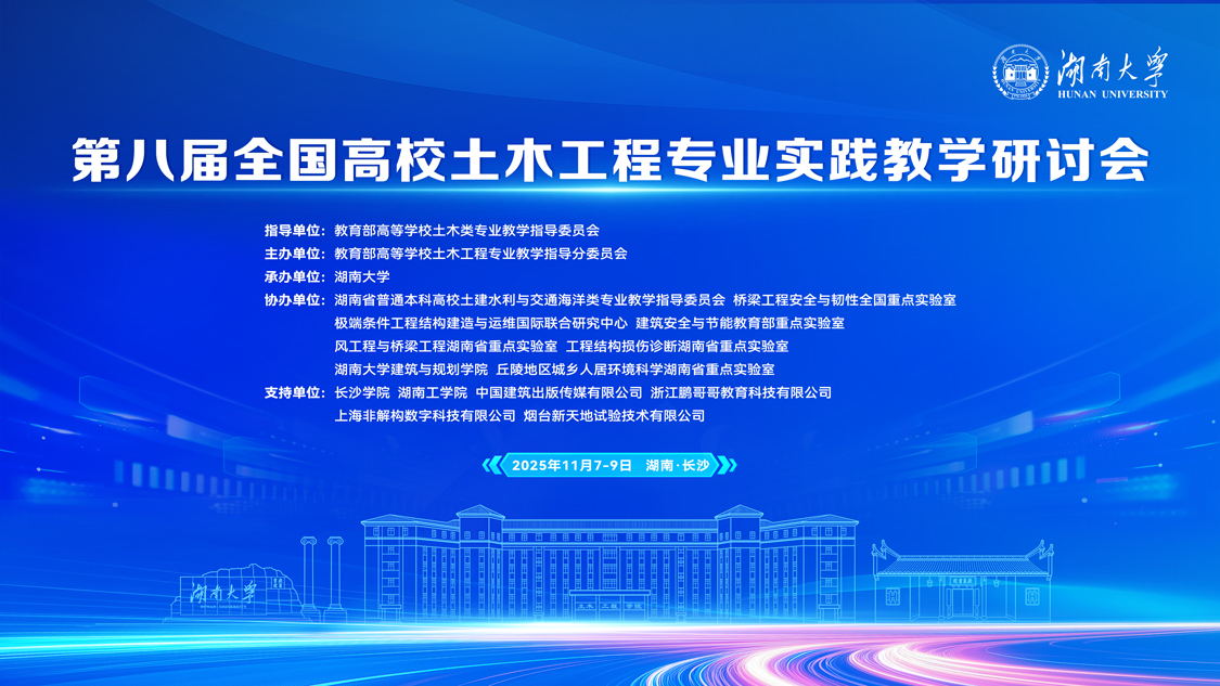 2025 年 11 月 7-9 日,第八届全国高校土木工程专业实践教学研讨会在湖南大学(湖南・长沙)顺利举办。本次会议由教育部高等公司土木类专业教学指导委员会指导,教育部高等公司土木工程专业教学指导分委员会主办,湖南大学承办,多家相关教学指导委员会、重点实验室及高校、企业联合协办支持。